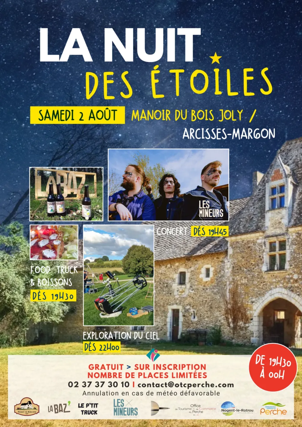 Troisième édition de cette soirée champêtre dans le Perche nogentais : troisième lieu d'observation ! Cette année, levez les yeux vers le ciel depuis le site du Manoir du Bois Joly à Arcisses-Margon. Programme : • Buvette & restauration avec la microbrasserie la Baz (bières et softs) et le P’tit Truck (Tartine et salade). • Découvrez le trio Yvelinois "Les Mineurs" : chansons à textes où se mêlent trompette, violoncelle, contrebasse, guitare et voix. • A la tombée de la nuit, les bénévoles de l’association Les Pléiades du Perche vous guident à travers la voute céleste grâce à leurs puissants télescopes. Possibilité de venir avec votre propre matériel d'observation.