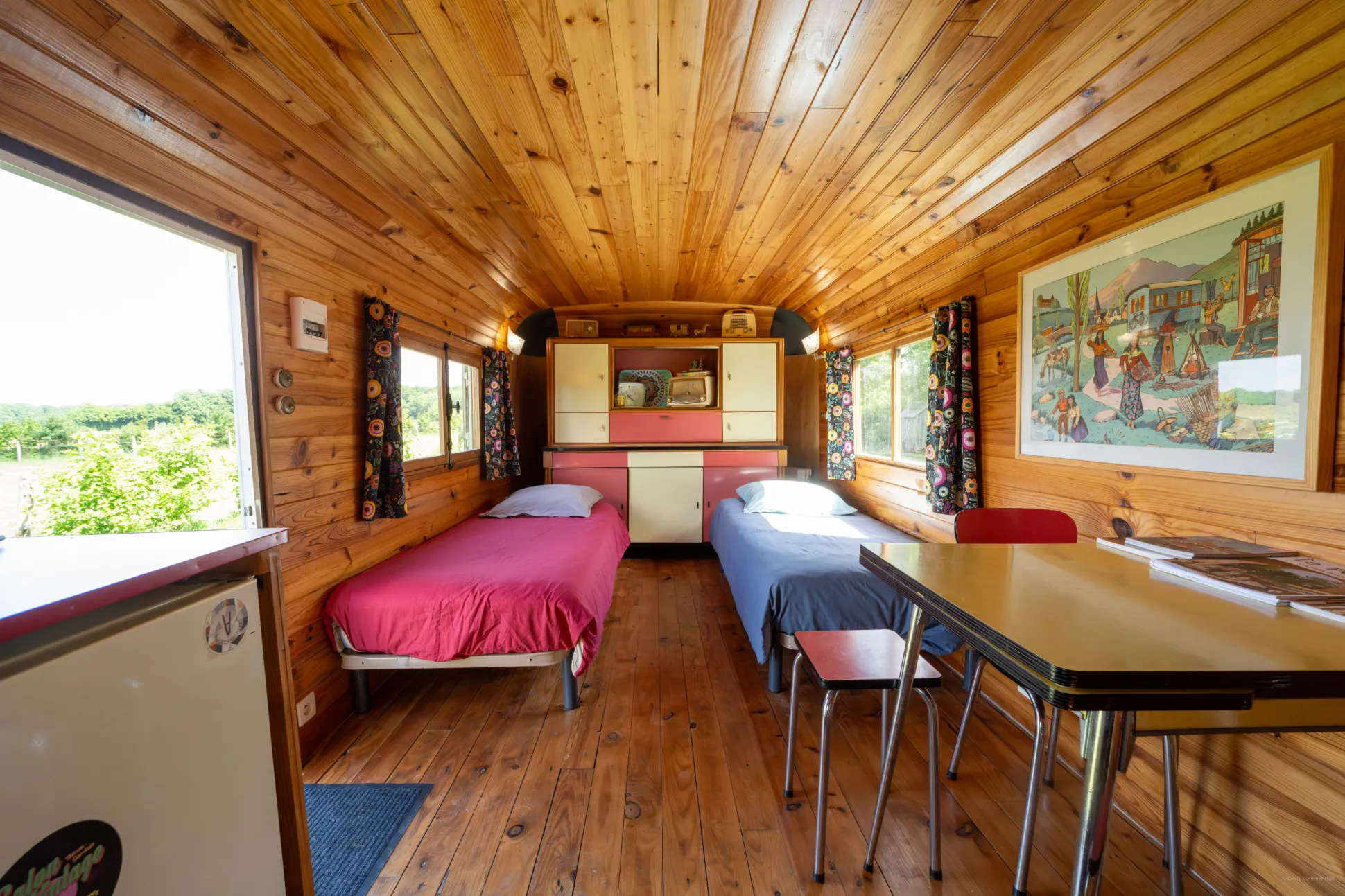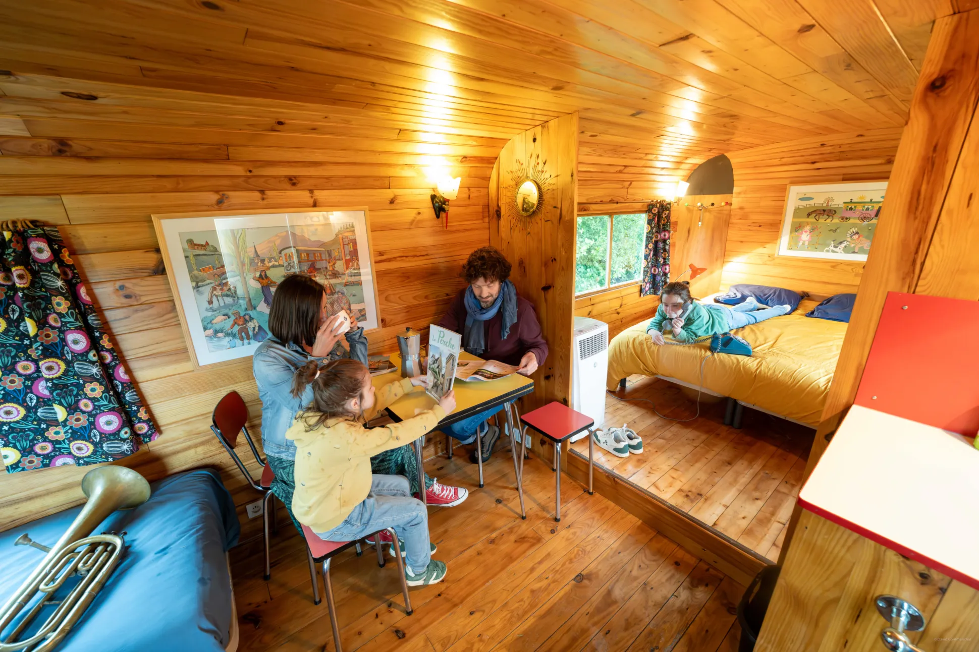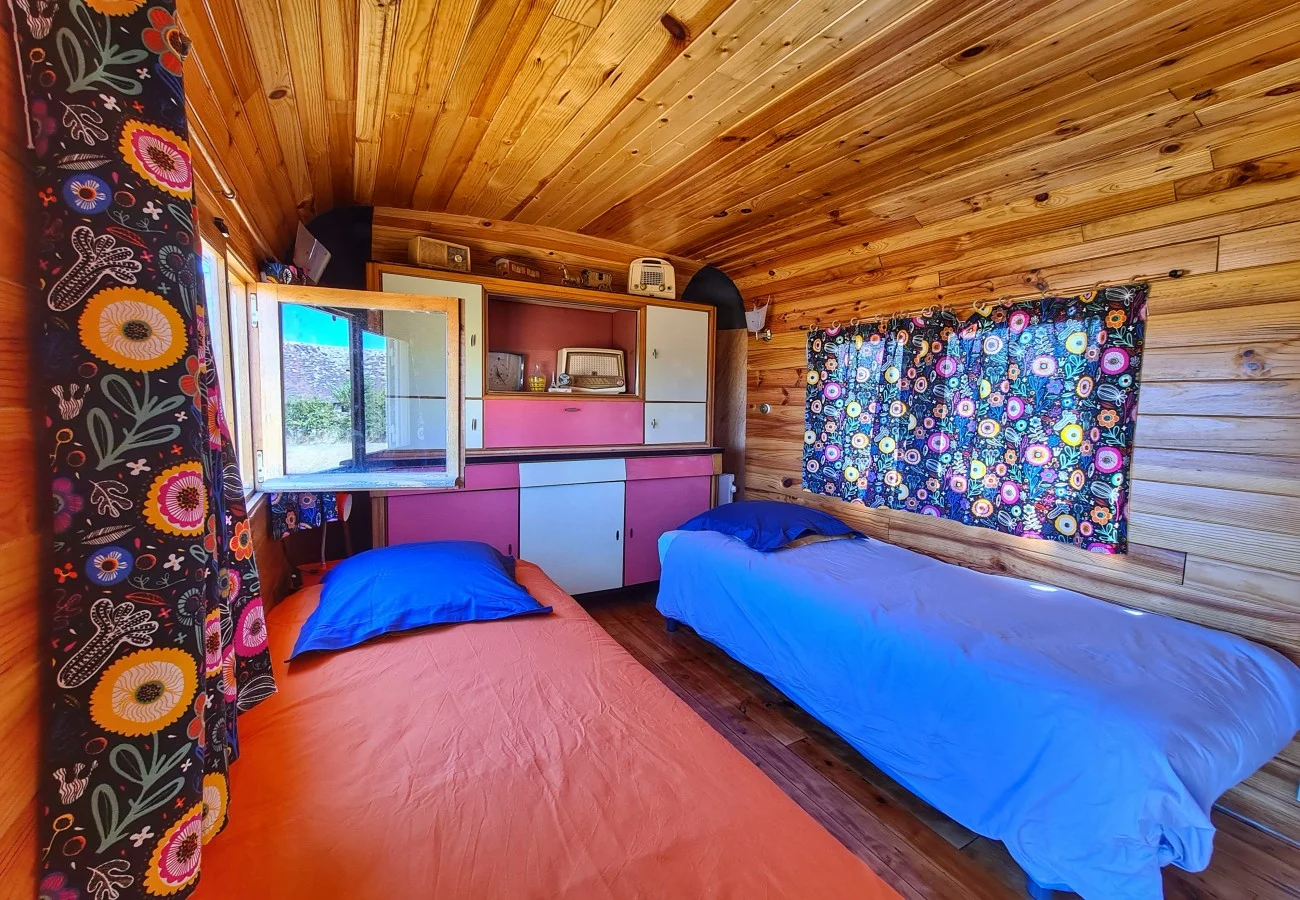 La « Roulotte Vintage » constituée d’une chambre et d’un séjour avec kitchenette.