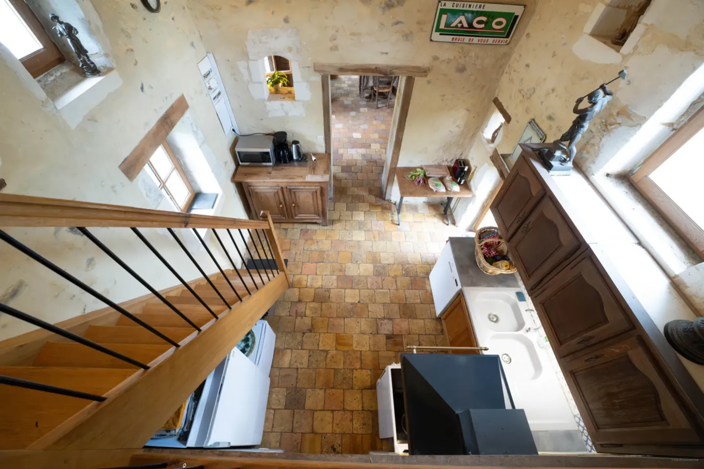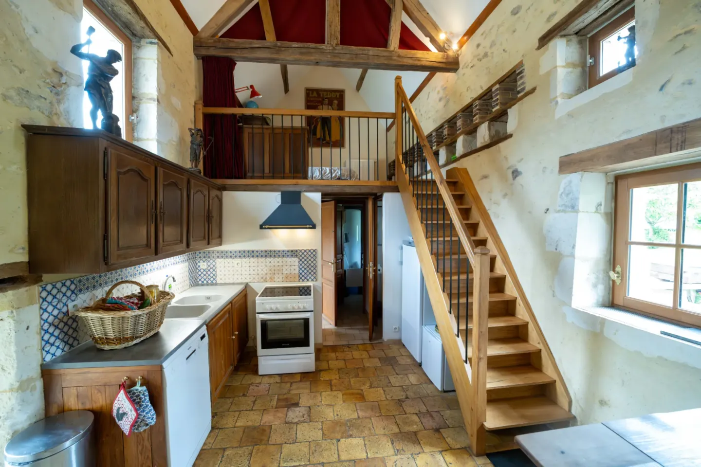Alliant confort et fonctionnalité, la cuisine est un lieu idéal pour laisser mijoter de bons petits plats… Pour le petit-déjeuner, pour une soirée entre amis ou un diner en famille, tout l’équipement moderne est proposé. L’imposante hauteur sous plafond donne une sensation de grandeur… La luminosité valorise l’enduit à la chaux…