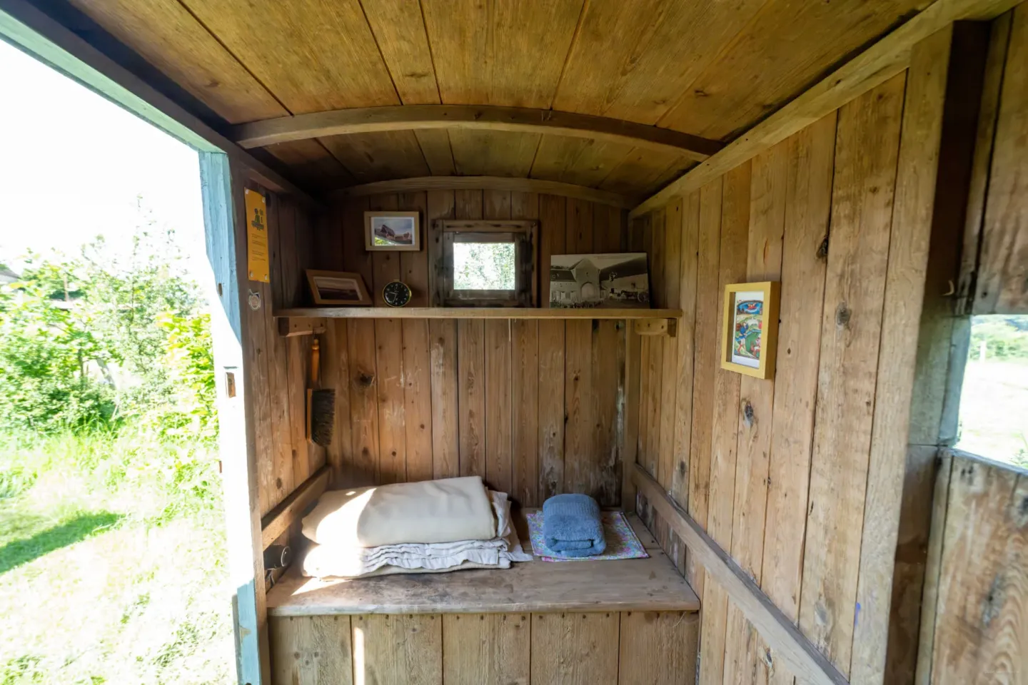 Il possède un coin assis avec deux banquettes et différents espaces de rangement (placards, étagères). Reliée à l’électricité, vous disposez d’une applique pour l’éclairage et d’une prise.