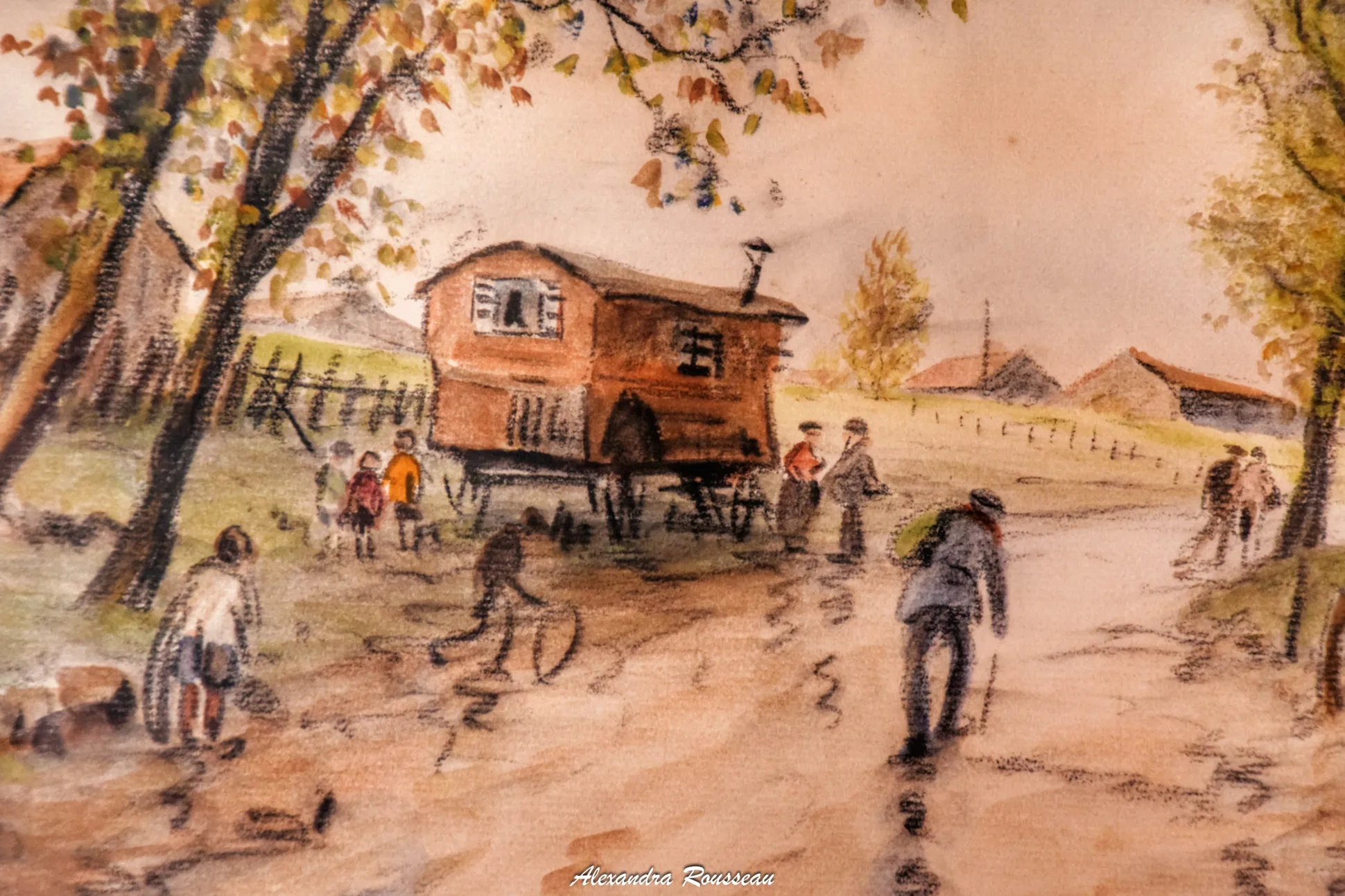 Passionnés par cet esprit bohème, nous avons réuni au fur et à mesure du temps plusieurs tableaux et gravures de roulottes. Le soir, pour s’évader, plusieurs interrupteurs chinés allument la lumière tamisée des petites lampes vintages… Lorsqu’elles s’éteignent, chacun peut rêver sur l’un des deux petits lits…