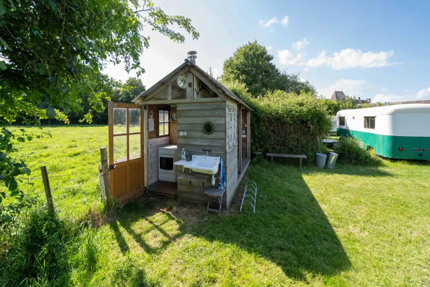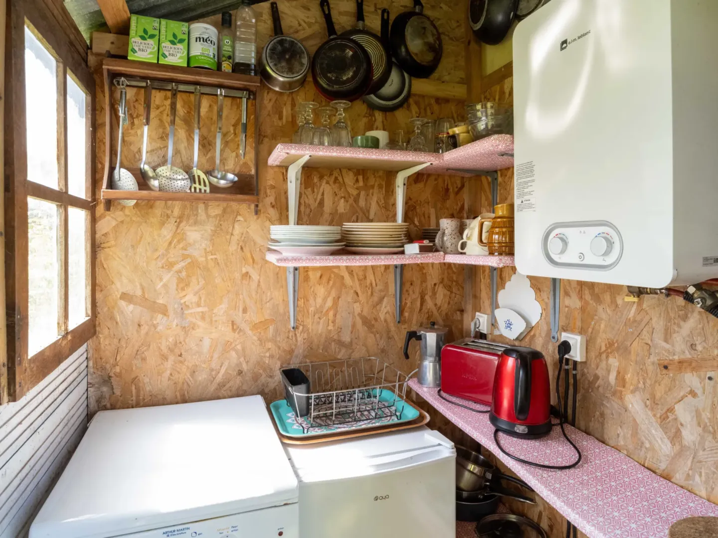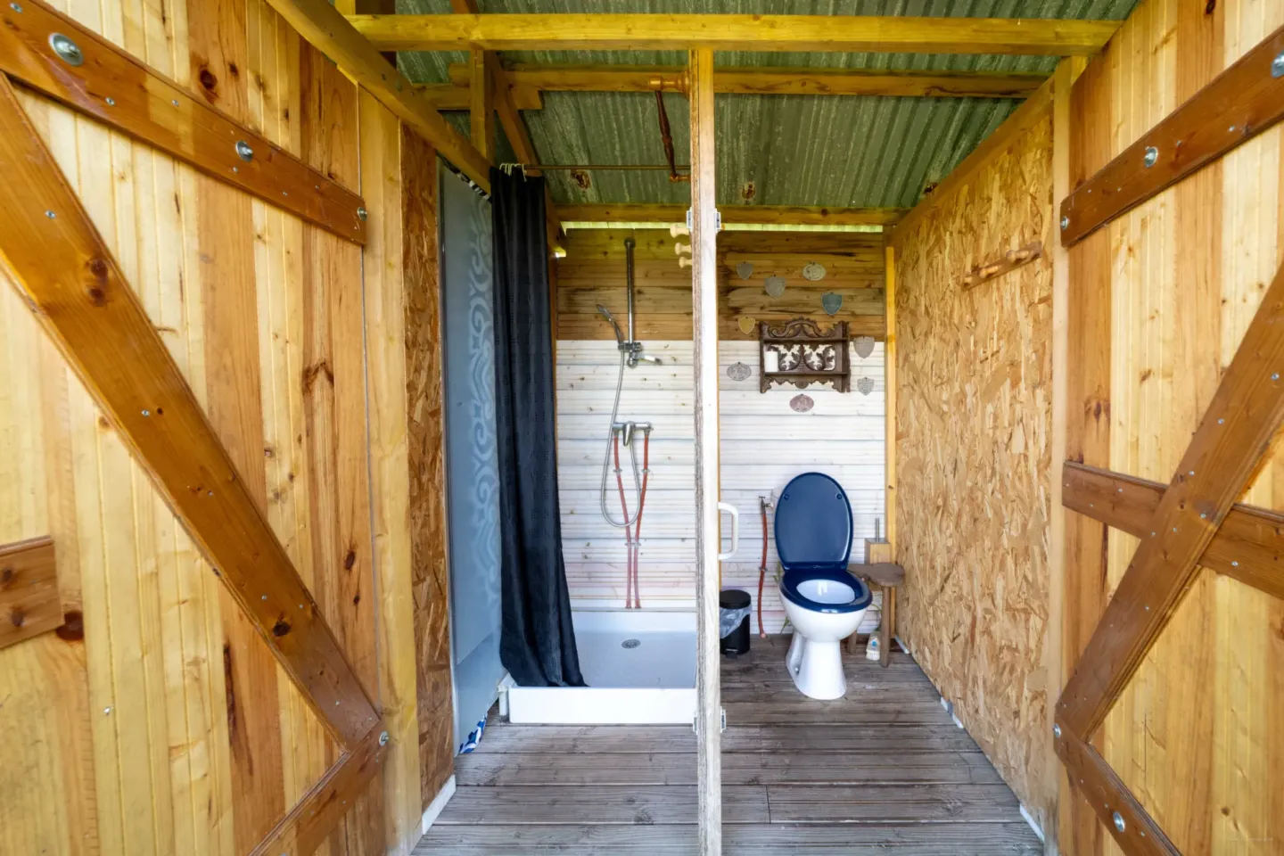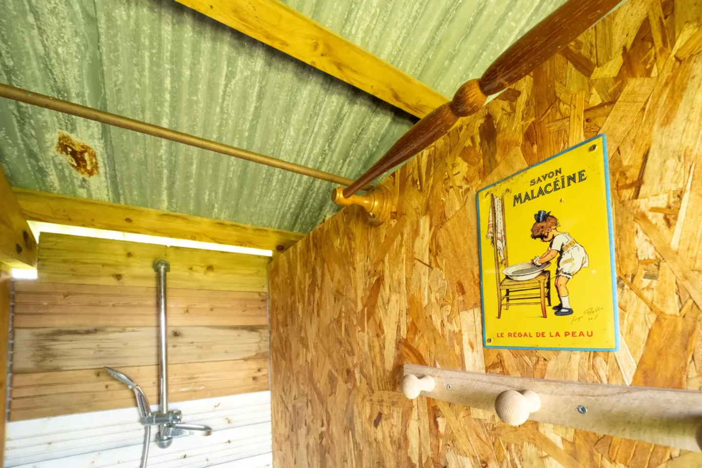 A une dizaine de mètres de la Roulotte Gitane, de la Roulotte Vintage et des Cabanes de Berger, vous trouverez notre coin Sanitaires et Cuisine !