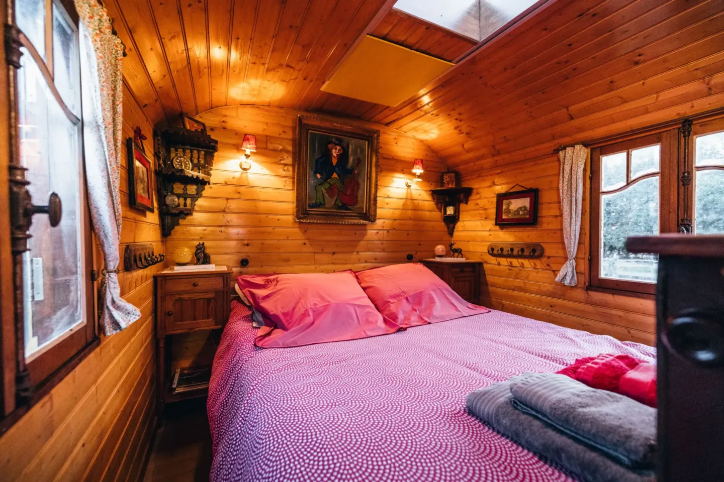 Derrière deux portes coquettes et moulurées, chacun accède à cet intérieur plutôt original. Véritable alcôve, la petite pièce indépendante est au fond de cette caravane de luxe.