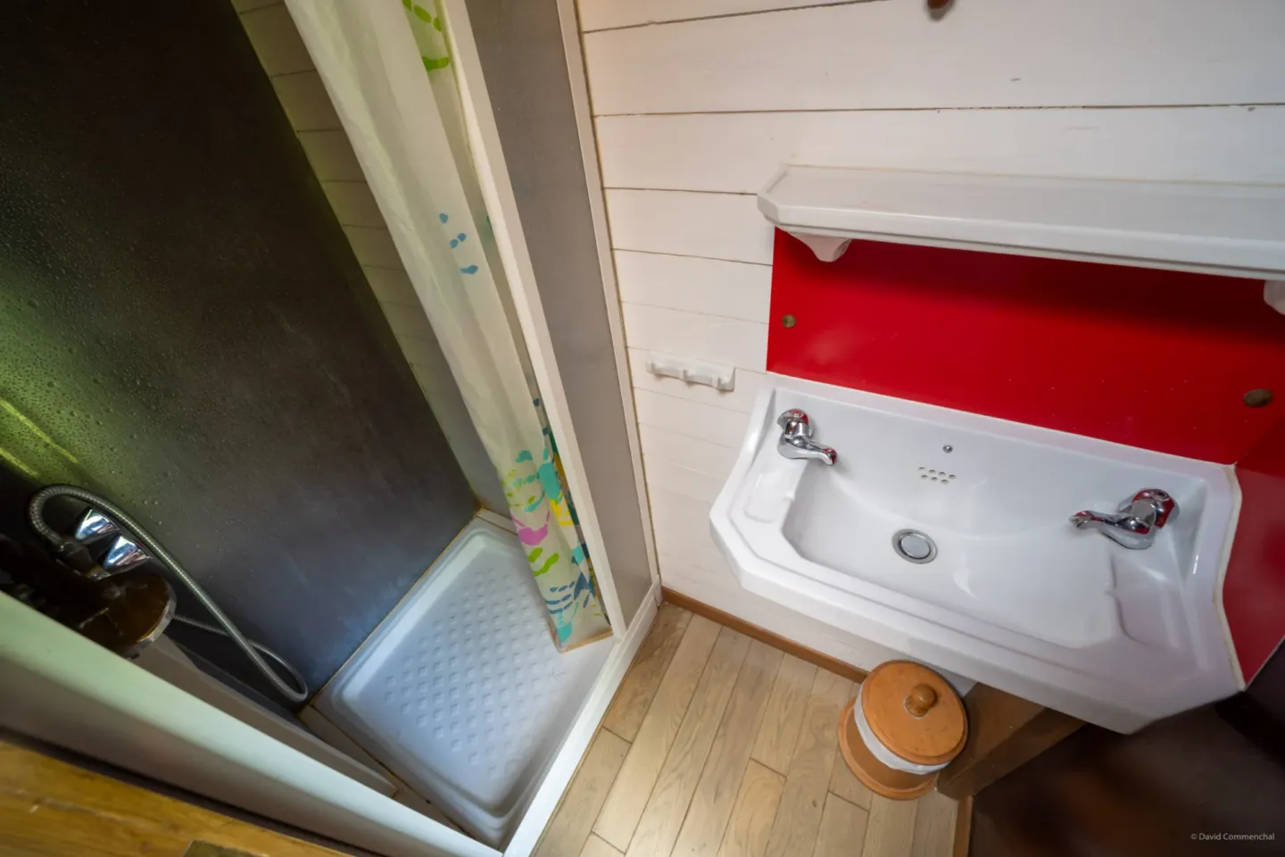 Comme dans un bel appartement d’avant-guerre, un cabinet de toilette est installé à côté de l’entrée. Cette petite salle d’eau a été imaginée derrière les boiseries et les miroirs des anciens placards. Créée de toutes pièces avec une douche, un lavabo en porcelaine vintage, la pièce existait à l’origine au fond de la roulotte.