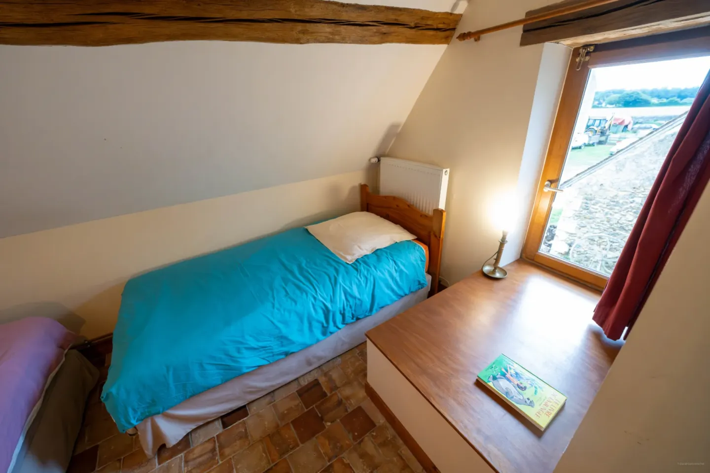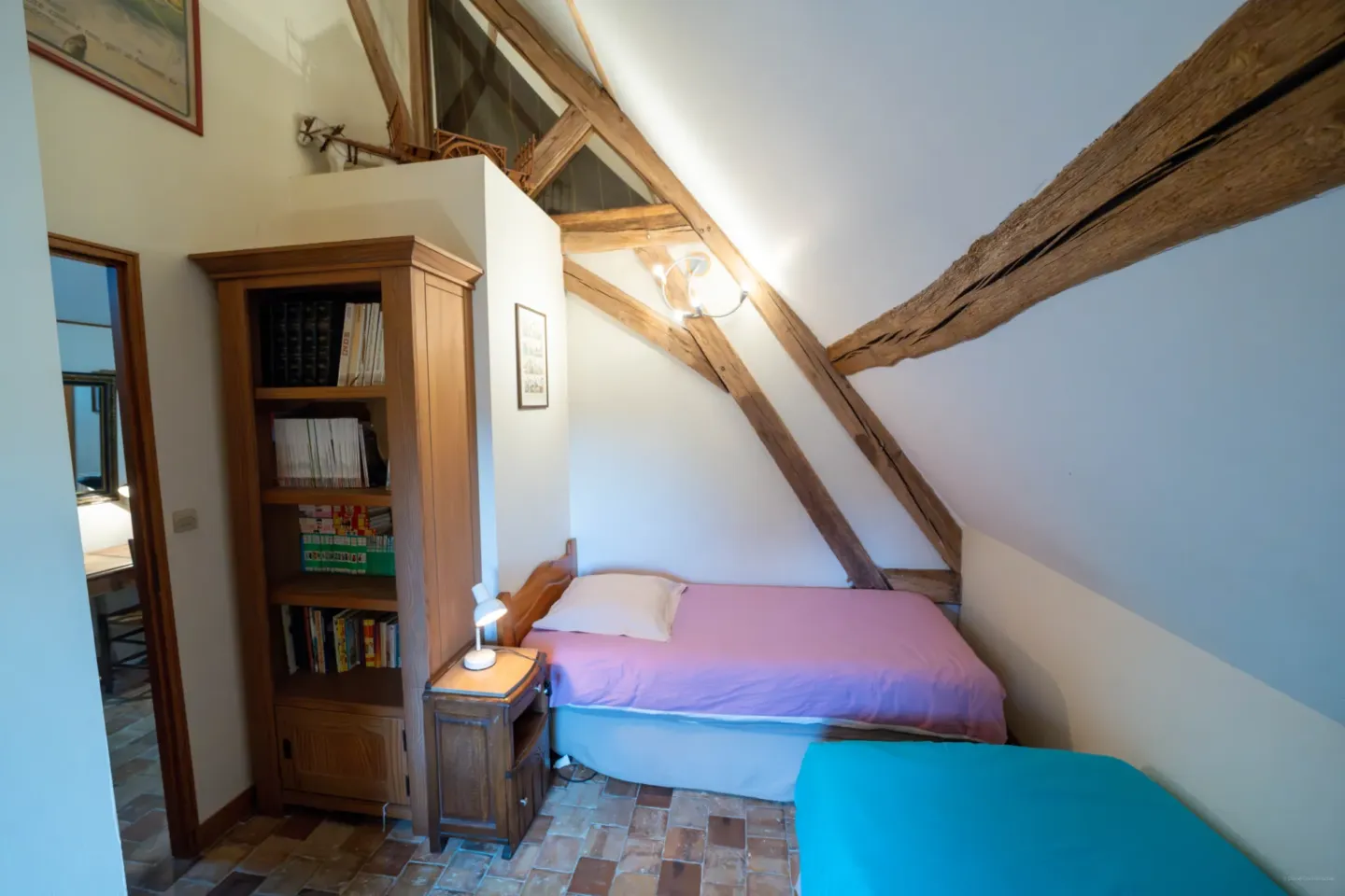 Pour s’allonger, tout le confort est misé sur une literie de grande qualité. La douceur des draps en coton permet de se reposer sous la couette. Les grands rideaux, les tapis de jonc de mer, donnent une ambiance chaleureuse. L’intimité est renforcée par de grandes hauteurs sous les toits, valorisant toute la charpente en chêne.