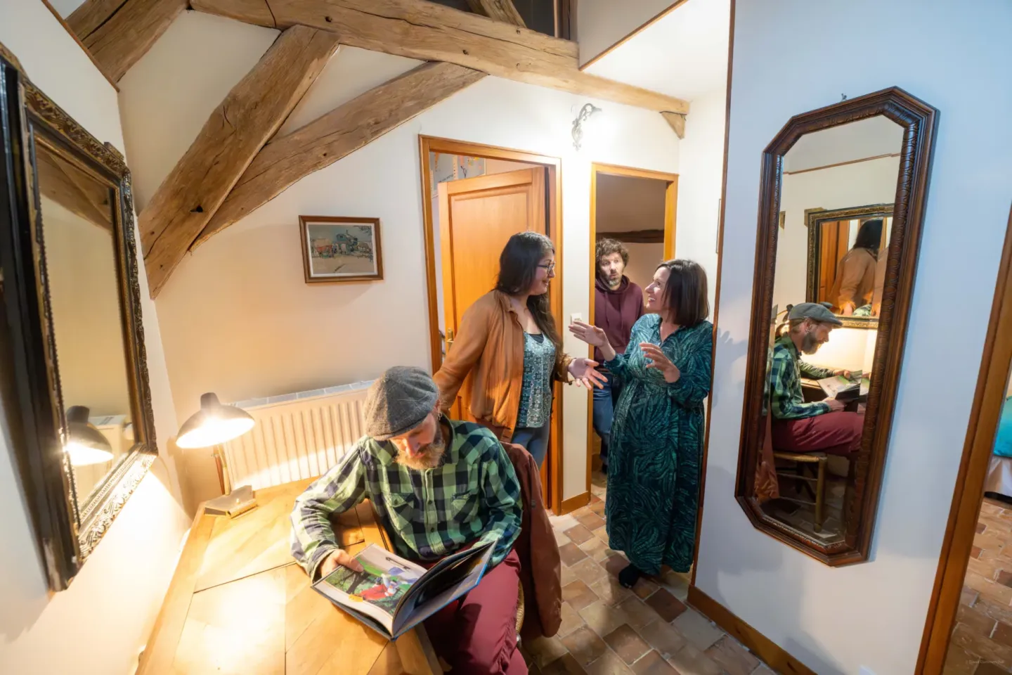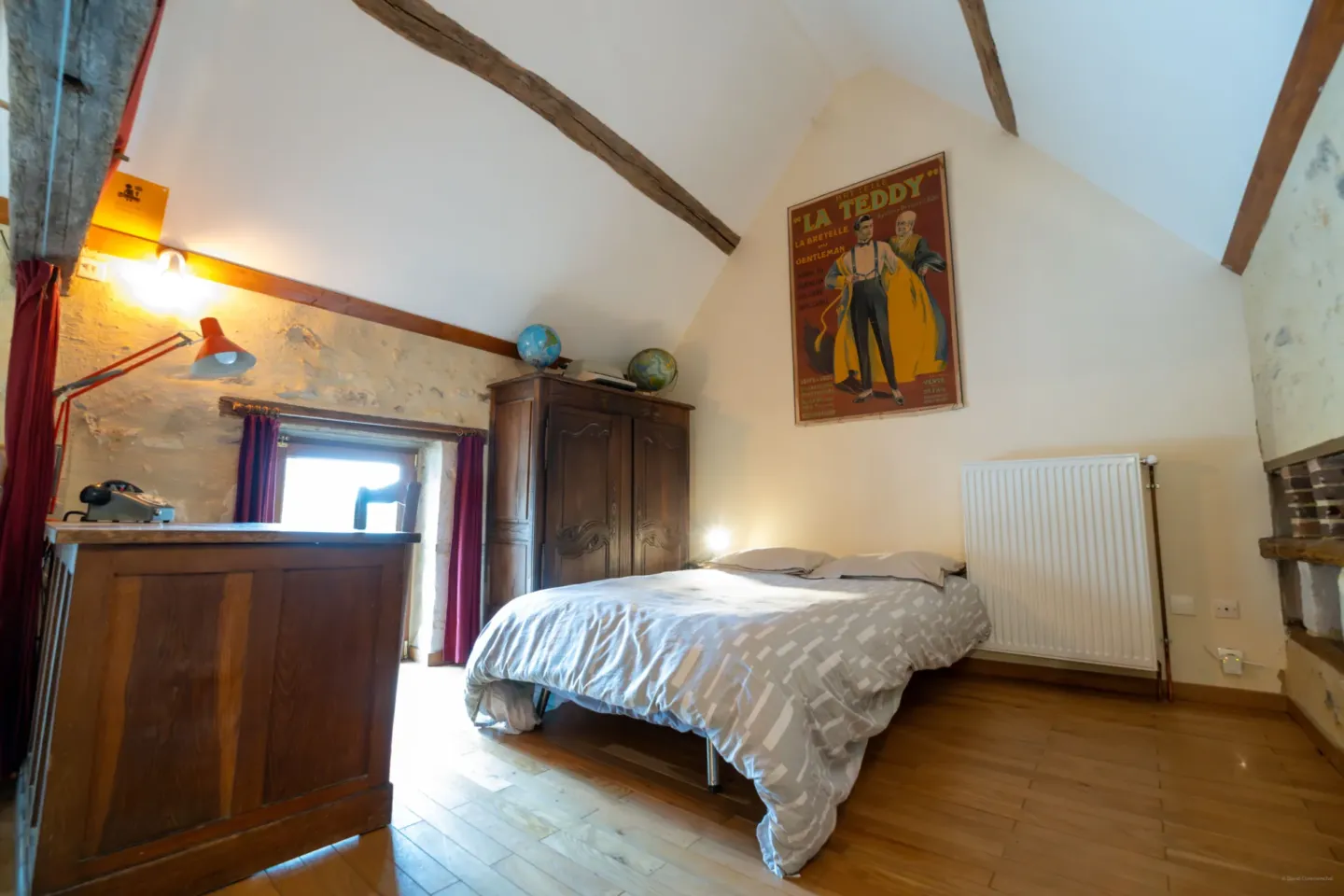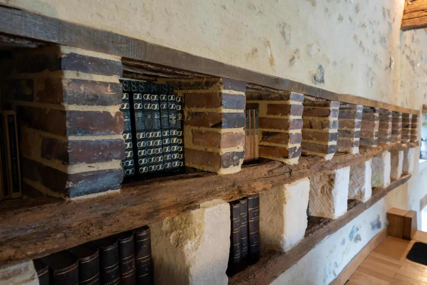 Afin de préserver l’histoire agricole du bâtiment, les niches prévues pour les poules sont transformées en bibliothèque. Depuis quelques années, pour s’assoupir ou même dormir, un canapé en cuir se transforme en lit pour deux personnes… Le bureau en chêne des années 1940 permet de travailler ou de bouquiner…