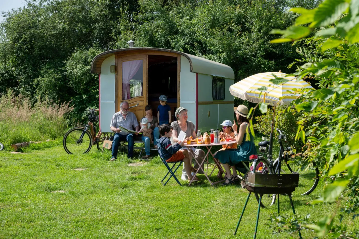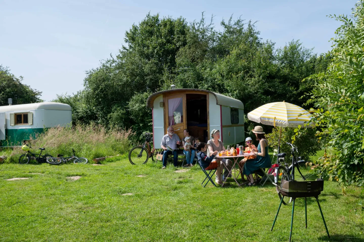 Pour se reposer après une randonnée dans la campagne du Perche, pour déguster une bonne salade de fromage de chèvre au soleil ou profiter du ciel étoilé de la région, cette caravane est équipée d’un salon de jardin et de plusieurs chaises longues.