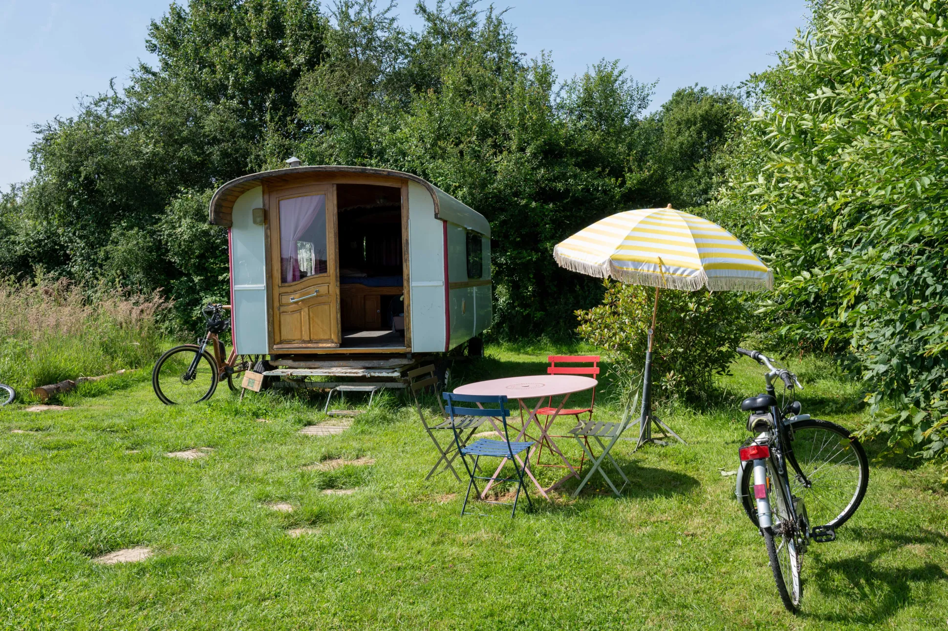 Pour se reposer après une randonnée dans la campagne du Perche, pour déguster une bonne salade de fromage de chèvre au soleil ou profiter du ciel étoilé de la région, cette caravane est équipée d’un salon de jardin et de plusieurs chaises longues.
