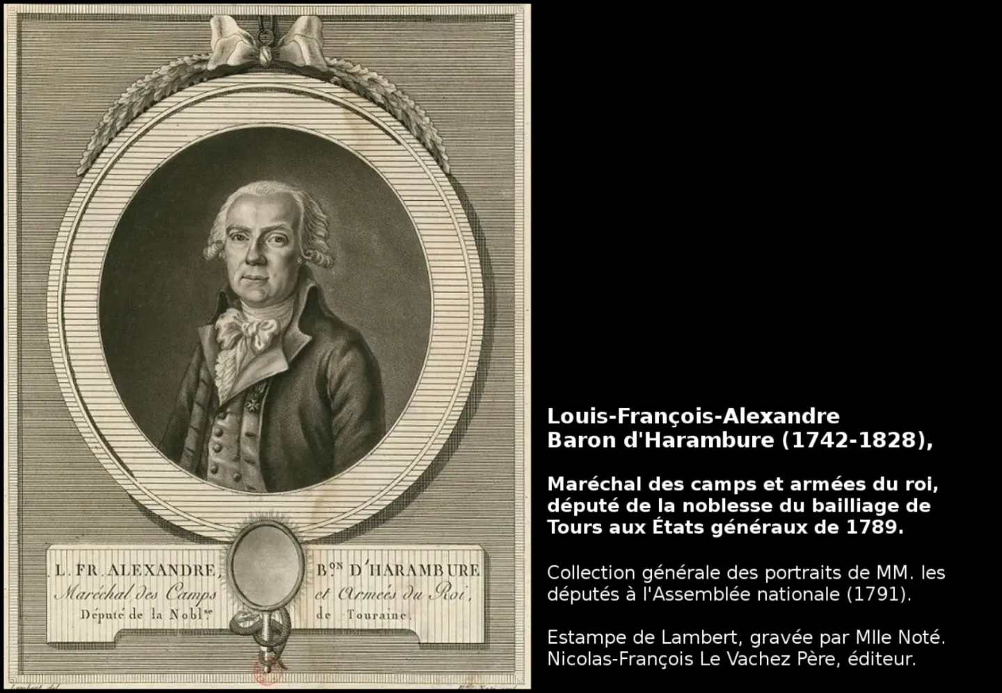 En 1797, Françoise Magdeleine Mégissier se marie avec Louis François Alexandre, Baron d’Harambure. C’est un second mariage pour ce général français, homme politique. Il vit alors en Touraine où il possède beaucoup de propriétés. Entré dans le régiment de dragons de Bauffremont en 1757, le baron d’Harambure passe capitaine en 1760. Il fait les dernières campagnes de la guerre de Sept Ans et devient major, puis colonel, au Régiment Royal-Roussillon cavalerie. Il est fait chevalier de Saint-Louis en 1771 et brigadier en 1781. Il est nommé maréchal de camp en 1788, employé au camp de Saint-Omer. En 1789, il est député par la noblesse du bailliage de Tours aux états généraux. Partisan de la Révolution, il publie une brochure où il démontre la nécessité de la réunion des trois ordres. Cependant, dans des séances de 1790 et 1791, il s’oppose à la suppression de la noblesse et des différents ordres de chevalerie. Il reprend son grade de maréchal de camp et est envoyé comme général à l’armée du Rhin. Après un procès retentissant pour ses engagements royalistes, le tribunal révolutionnaire l’acquitte solennellement en 1793. Malgré ce jugement, la Convention ne le rétablit pas dans ses fonctions. Depuis cette époque, il ne figure plus ni dans les armées, ni dans aucun corps administratif ou judiciaire. Il ne reparait sur la scène politique qu’en 1815, après le retour des Bourbons, lorsque Louis XVIII le nomme commandeur de l’ordre Saint-Louis. La même année, il préside le collège électoral de Loches où il appuie le choix des royalistes. Le Baron d’Harambure décède à l’âge de 86 ans en 1828.