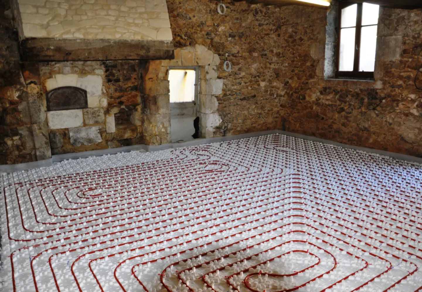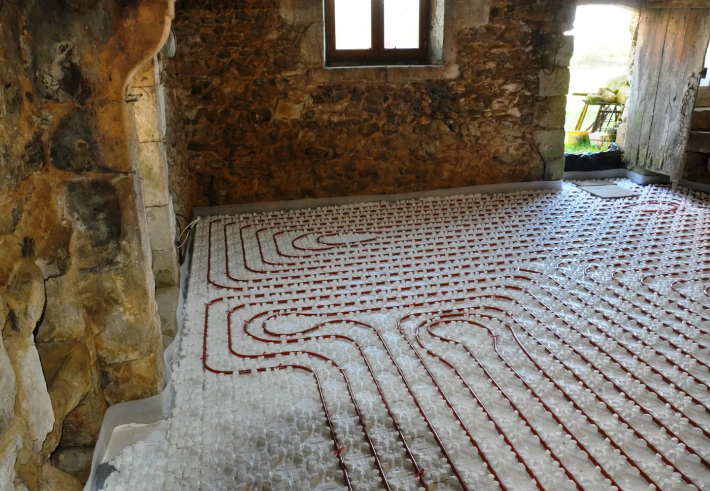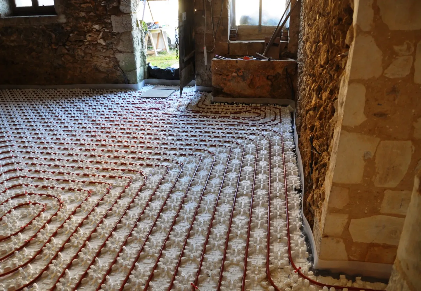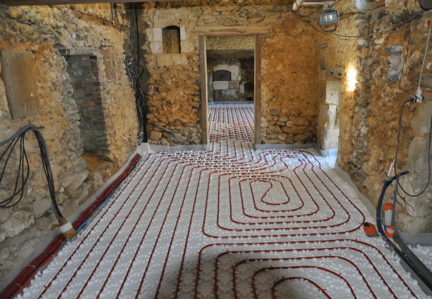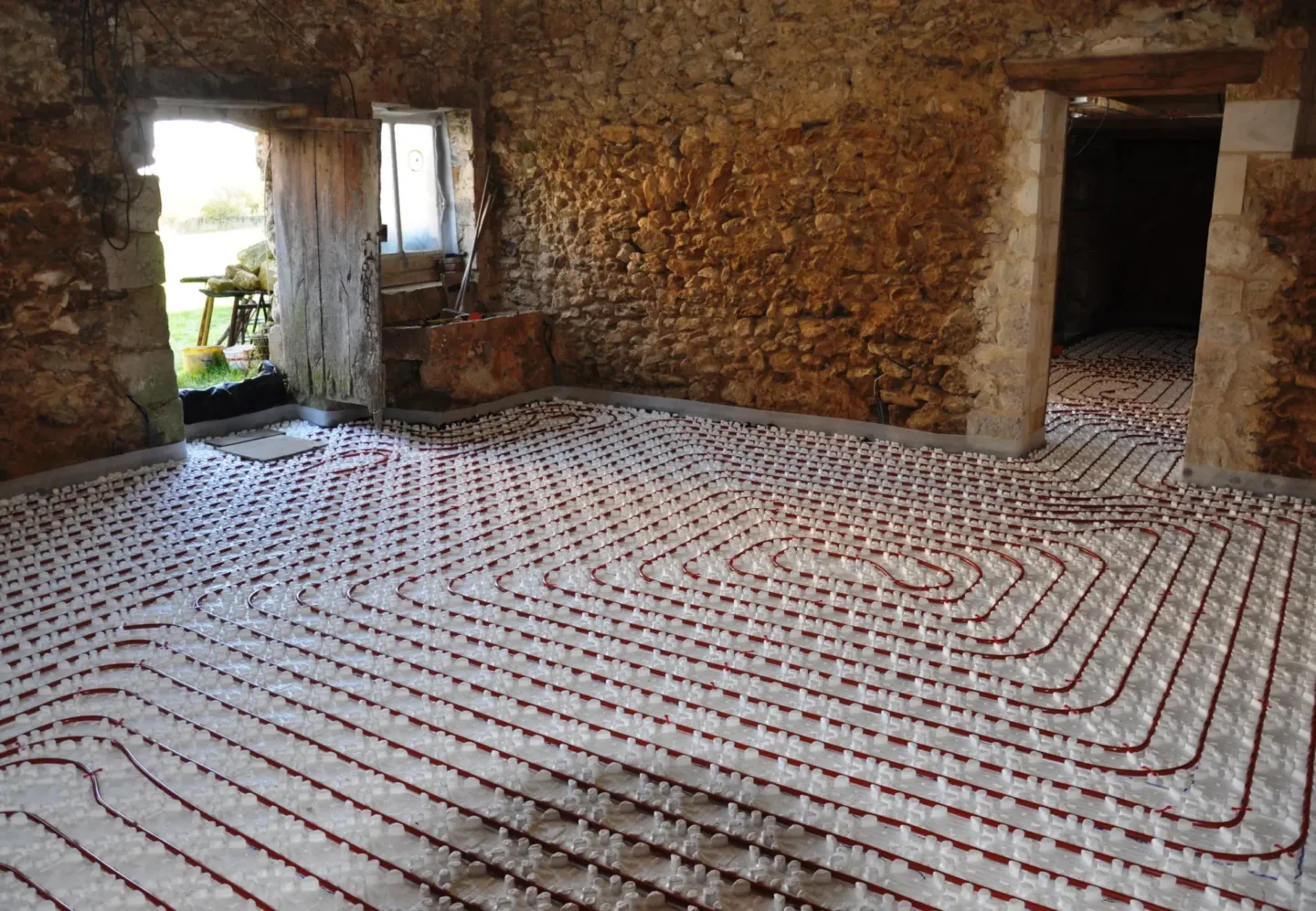 Pour des raisons écologiques et pour éviter une consommation d’énergie trop importante, d’électricité ou de fioul, une pompe à chaleur a été installée pour le chauffage du gîte. Un professionnel agrémenté s’en est chargé. Pour plus de confort, nous avons disposé l’ensemble du système de chauffage par le sol. Après le coulage d’une dalle spécifique, des tomettes en terre cuite ont été posées.