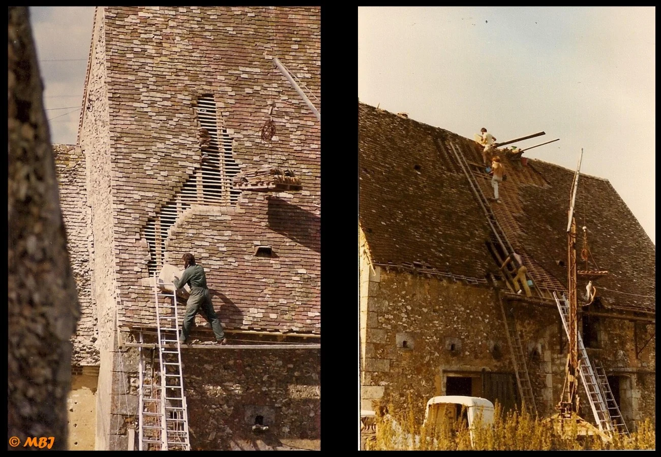 À partir de 1985, lorsque nous arrivons, la restauration des toitures est la principale priorité. Les ¾ sont progressivement refaites… Un équipement sécurisé et adapté s’avère nécessaire. Une grue de chantier, des échelles, une bétonnière sont acquis.
