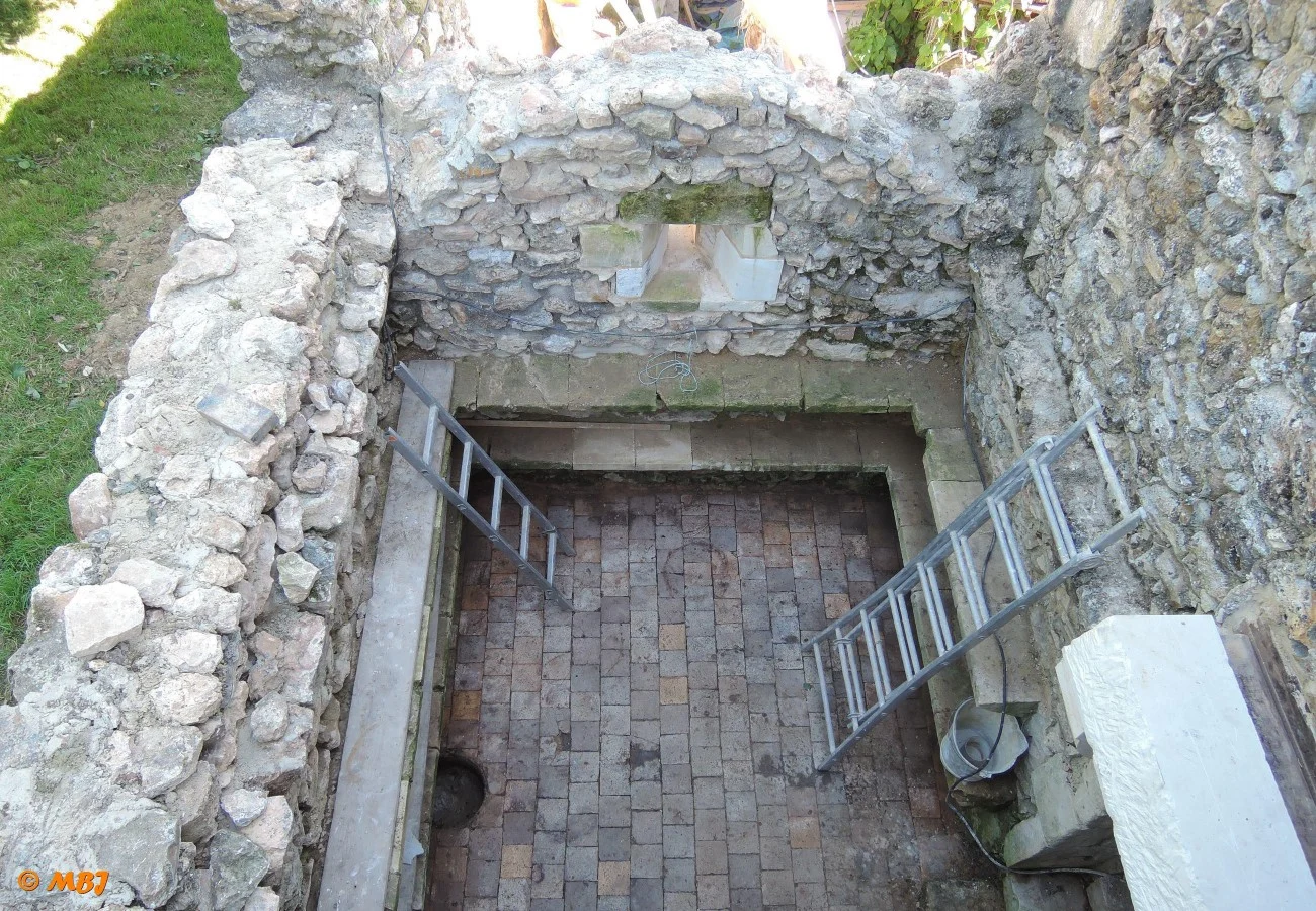 En 2016, après avoir remonté les murs de la cave, nous reconstruisons sa voûte. L’emplacement dans le mur est encore visible pour retrouver ses proportions. Le moule est fait à partir de plaques de contre-plaqués fins et humidifiés. Une « charpente » est montée en dessous à partir d’une douzaine de bastaings.