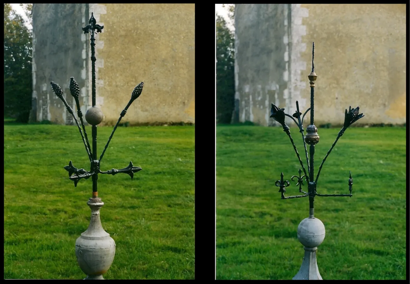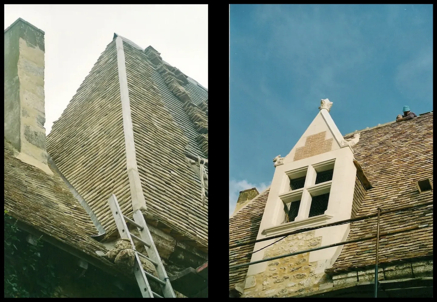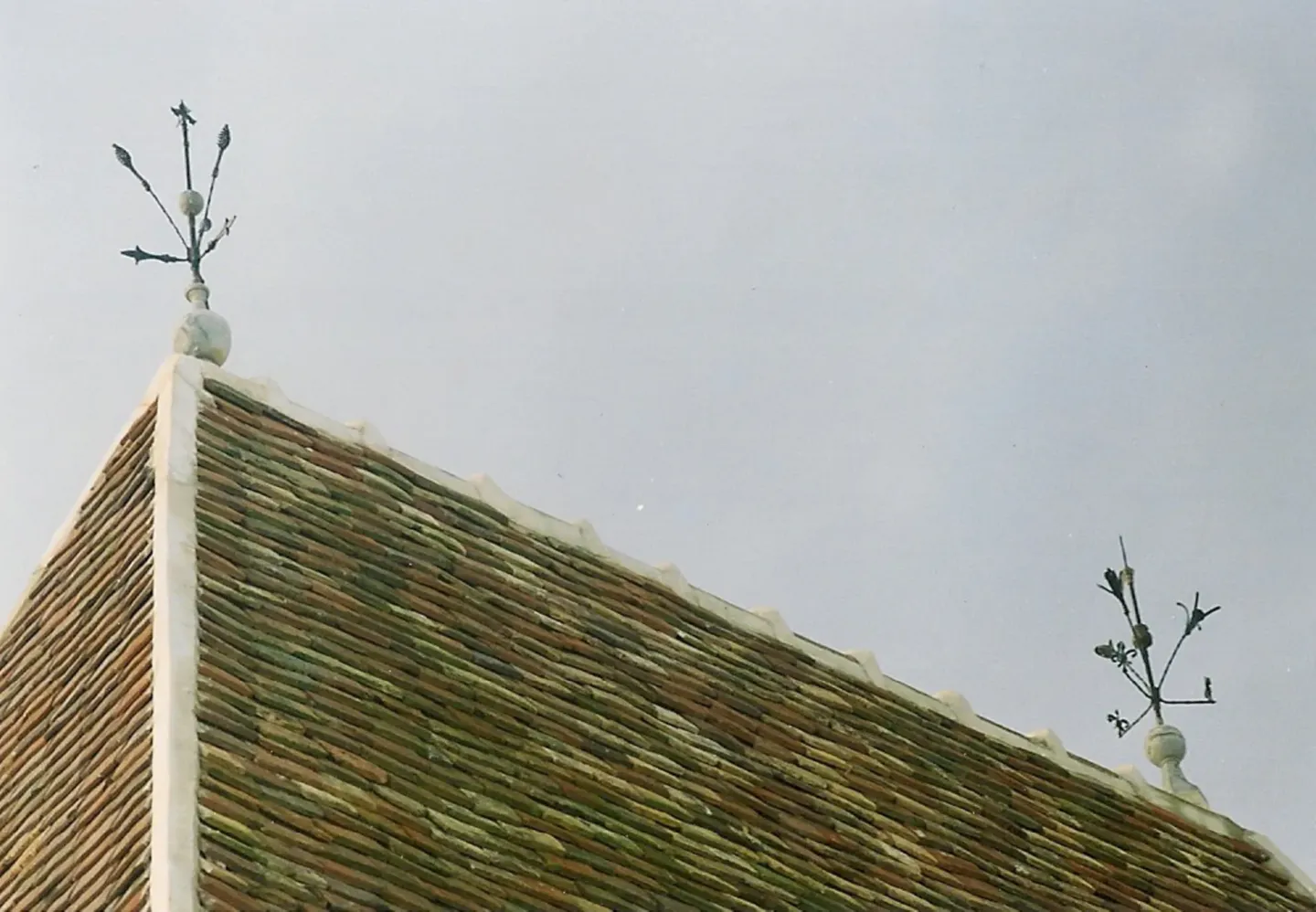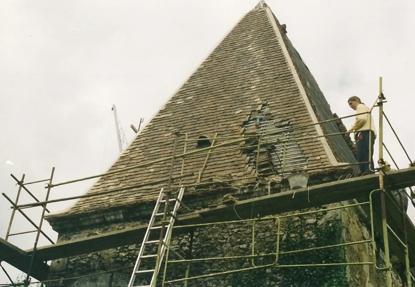 En 2002, après le remontage de la charpente de la tour, l’ensemble de la couverture a été restaurée. Nous avons utilisé des lattes en chêne comme à l’origine. Quelques tuiles d’origine ont été réutilisées, mais la plupart proviennent de lots achetés depuis 1986 dans différentes fermes du Perche. Compte-tenu de la pente de toit importante et des risques de tempête, le tiers des tuiles a été cloué. Des épis de faîtage en métal ont étés réalisés pour l’occasion pour dominer la bâtisse…