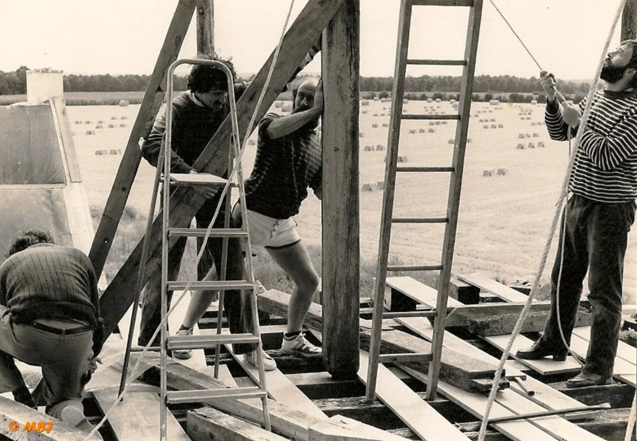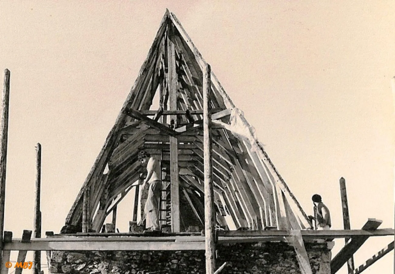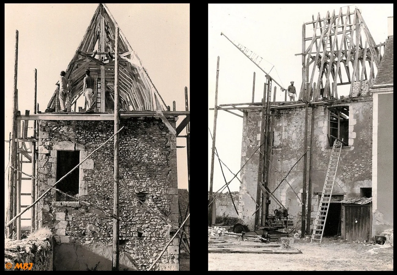 A notre arrivée en 1985, il est inenvisageable de refaire cette magnifique charpente à chevrons formant ferme sans la démonter entièrement. Sans tuiles depuis plusieurs années, elle est alors en piteux état. La majorité des assemblages est à refaire, les pièces maîtresse sont à changer (poutres porteuses).