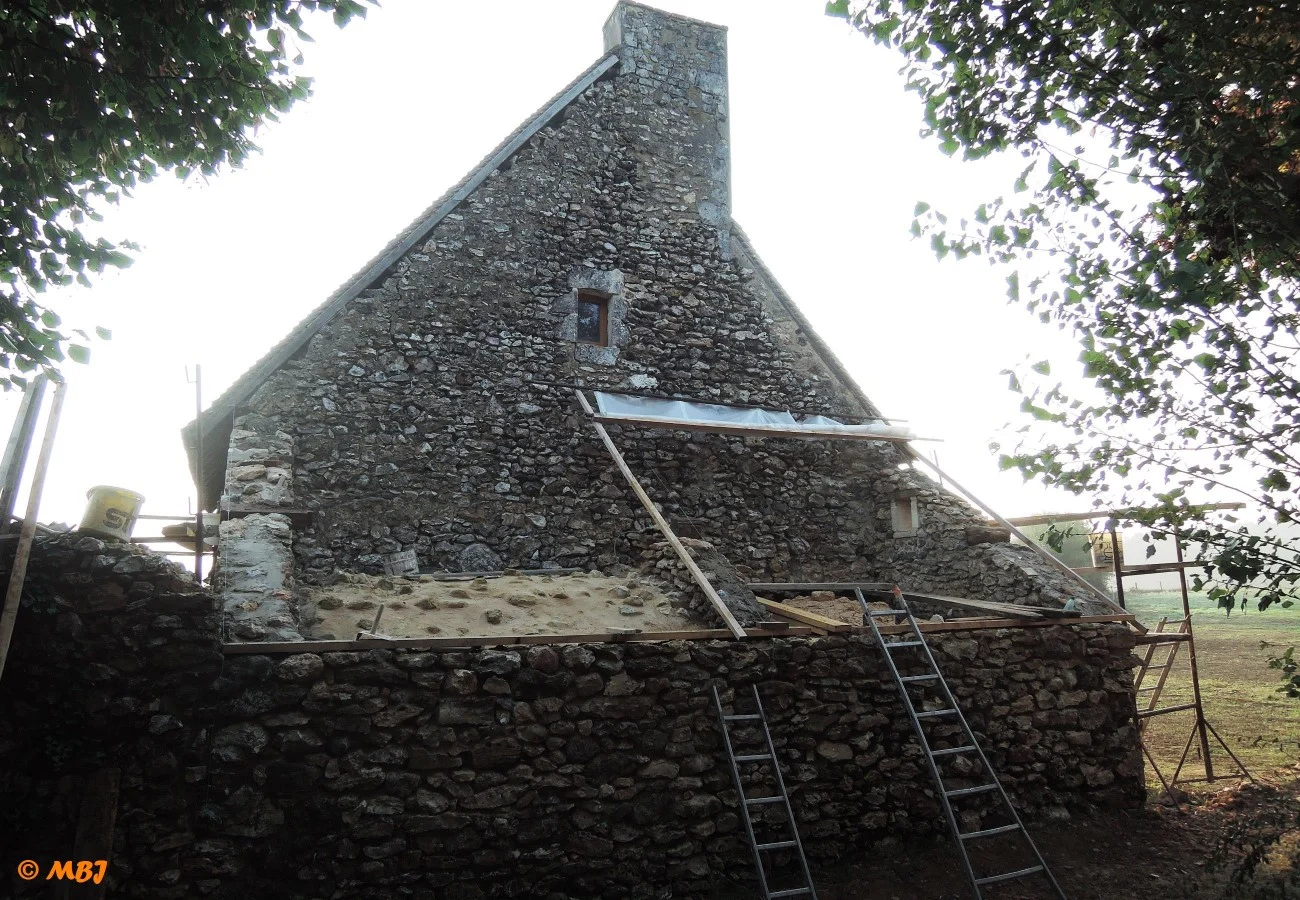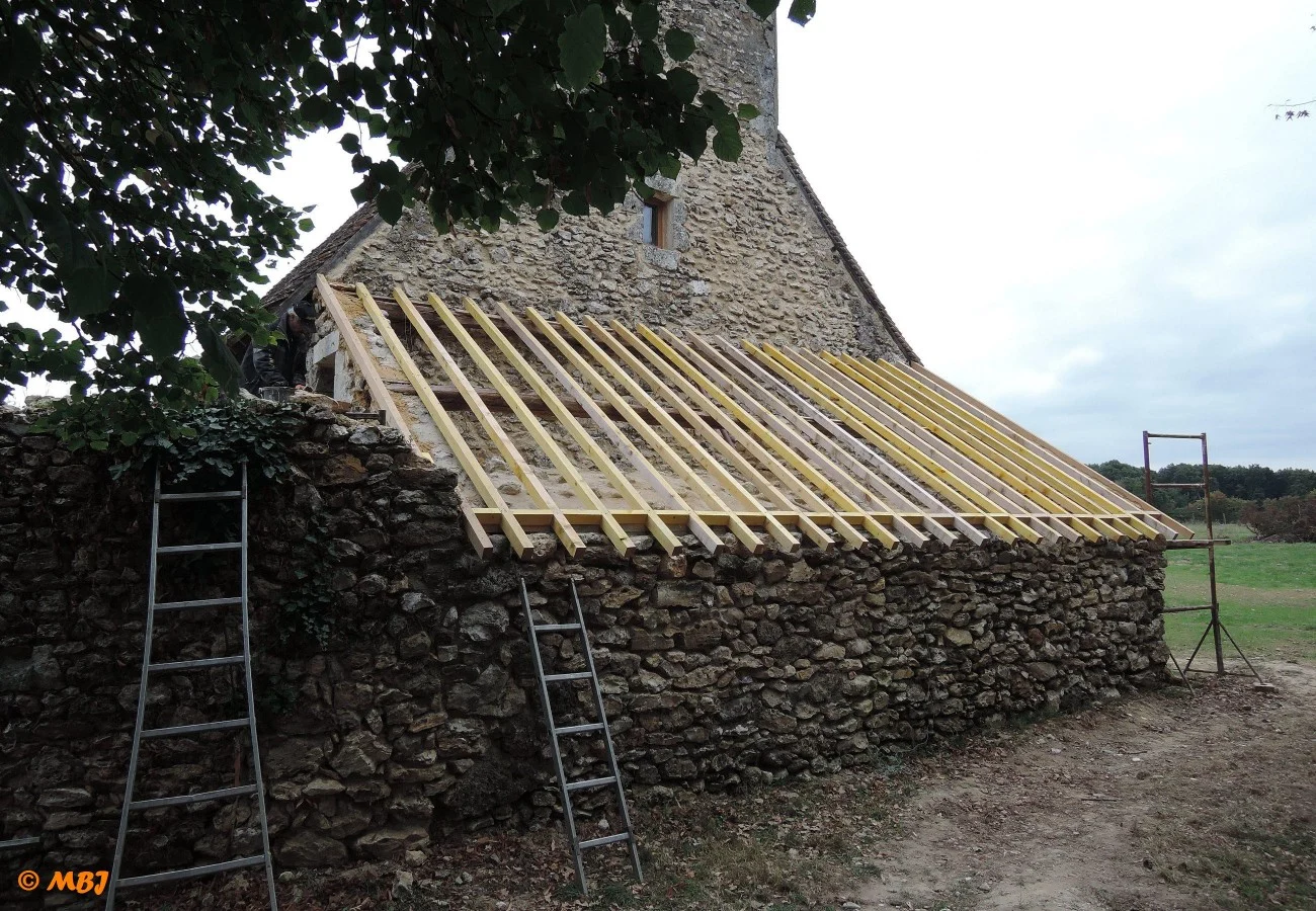 En 2016, après avoir remonté les voûtes de la cave et du four à pain, nous avons reconstruit la charpente et la toiture de cet appentis du fournil. Pour ce faire, nous avons repris les proportions de la toiture d’origine de la carte postale de 1905.